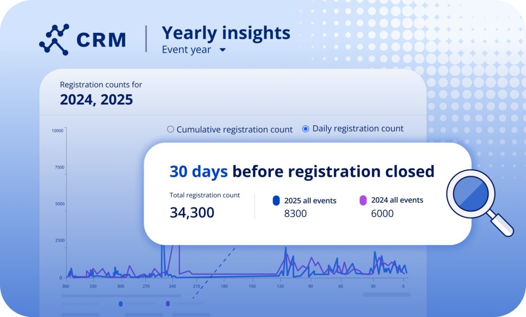 The new Yearly Insights Dashboard in Race Roster CRM offers a powerful way to track performance and uncover trends across all events in your Organization. You can effortlessly compare registration progress year-over-year and filter data for deeper analysis. The interactive graph allows you to hover over any point to see exact registration numbers, empowering you to make informed, real-time adjustments to your strategy.