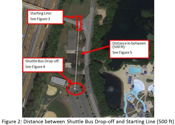- Participants receive bib numbers upon signing in at church on race day. Afterwards, shuttle buses will drop participants off at the starting line located by Crystal Springs. Participants will run/walk back to the finish line at church (See the Course Map below).