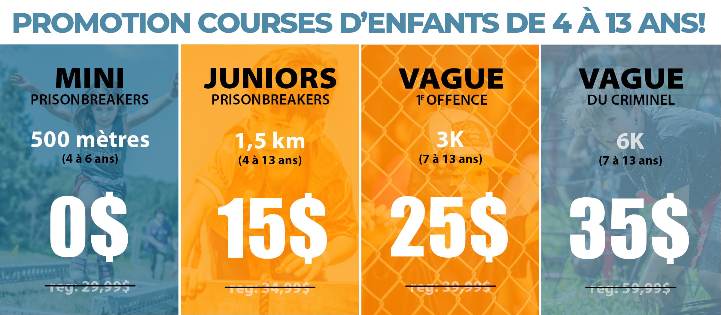 *** Children under 14 must be accompanied by an adult throughout their journey. You will be able to encourage your child, but will not be able to do the obstacles of the children's course. *NO ADDITIONAL FEES FOR THE PARENT REGISTERED IN THE 6 KM - NOT REGISTERED $10 ACCOMPANYING FEE.