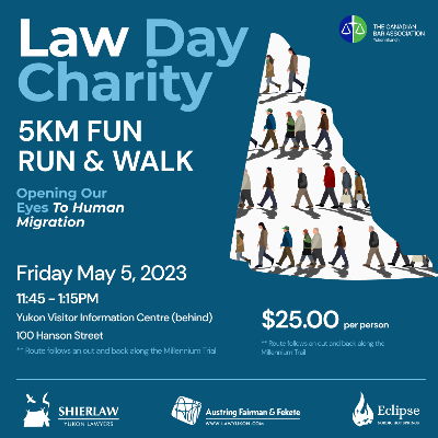 Join the Canadian Bar Association-Yukon for our Annual Law Day 5km Fun Run & Walk. This years run and walk will raise funds for Yukon Cares, with the theme of Opening Our Eyes to Human Migration. The Run & Walk will take place on Friday May 5, 2023 between 11:45-1pm, starting just behind the Yukon Visitor Information Centre, following a route along the Millennium Trail. Refreshments will be provided at the race and first 100 participants will receive a swag bag! Register online for $25 and lace up to join in the fun for a great cause.