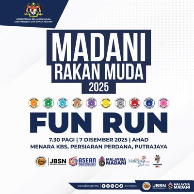 Bersempena Program Rancakkan Madani Bersama Malaysiaku yang berlangsung pada 5–7 Disember 2025, ayuh kita sama-sama turun padang memeriahkan Larian Madani Rakan Muda pada 7 Disember 2025!