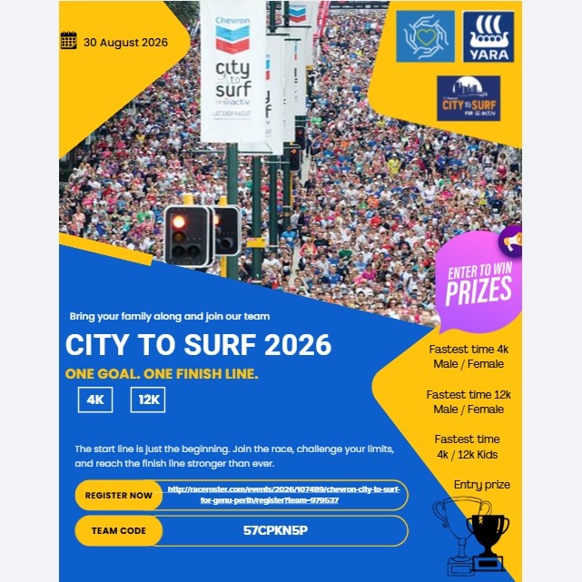 This year, we are proudly taking part in the 2026 Chevron City to Surf for genU! We are doing this to empower Western Australians living with disability - helping them grow their independence, achieve their goals, and live life to the fullest. Every donation fuels real change 🙌💙 Sponsor us and let’s cross this finish line together!