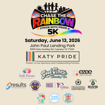 Celebrate community, inclusion, and pride while helping raise funds and awareness for Katy Pride’s mission. Whether you run, walk, or cheer from the sidelines, this event is all about coming together and showing our colors with joy and unity.
