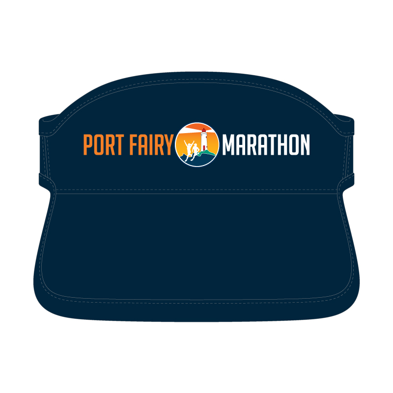 High quality navy blue adjustable visor with Port Fairy Marathon logo!