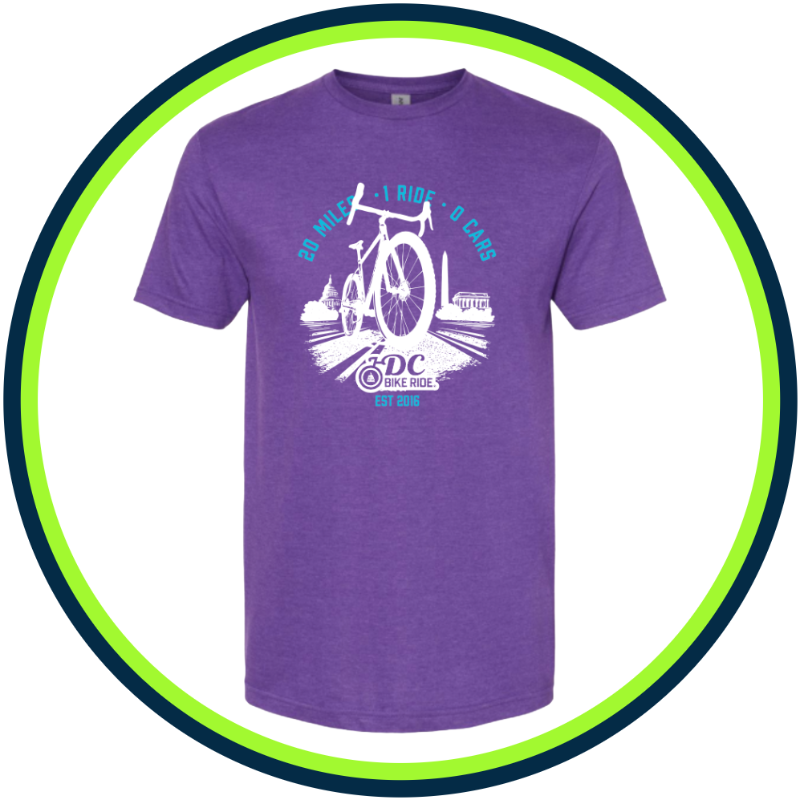 Commemorate your ride with our 2026 course map design. Select your size below. Available in 2 colors and unisex sizes from XS to 3XL. BLACK: Stylish and comfortable tee, with unisex slimmer fit and shorter sleeves, in a 100% Ringspun combed cotton 4.3 oz/sq.yd. fabric. . PURPLE:Classic Ringspun tee in a 4.5 oz 100% cotton, tubular 30/1 construction jersey fabric, with a double-needled sleeve and bottom hem.