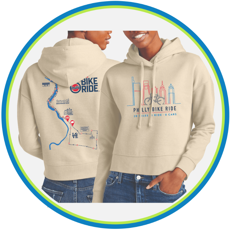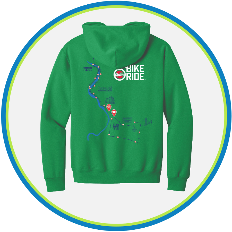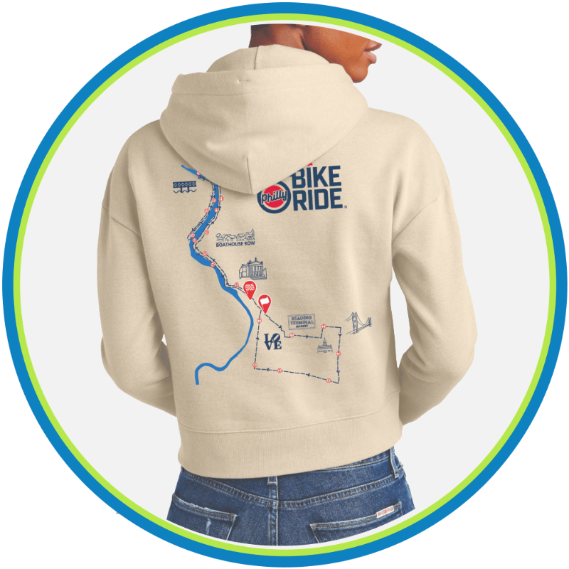 Commemorate your ride with our 2026 course map design. Available in unisex and women's sizes from XS to 3XL. • CREAM - Women's cut and fit hoodie, featuring a shorter body-length, dyed-to-match drawcords with stitched buttonholes, lined hood, drop shoulder, rib-knit hem and cuffs, in a 65% ring-spun cotton / 35% poly 8.3 oz/sq. yd. (280 gsm) fabric. • GREEN - Stay warm in this cool mid-weight hoodie, featuring kangaroo pockets, two-ply hood with grommets & dyed-to-match tipped and knotted drawstring, in an 8 oz/sq.yd. poly/cotton fleece fabric.