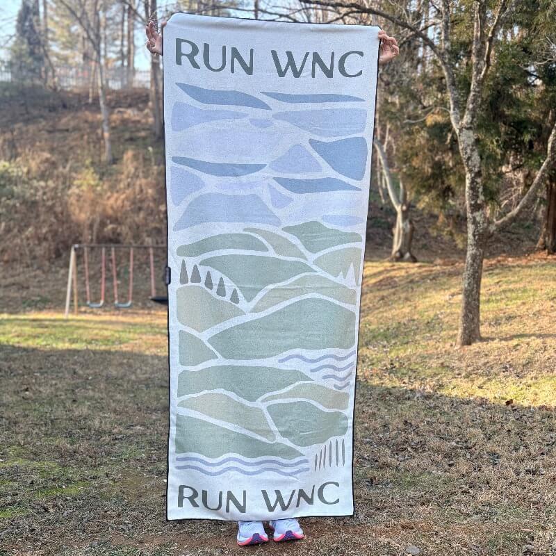 Absorbent, sand-resistant, and soft, it packs down small and works great as a car seat cover, gym towel, or trail companion. Finished with our custom RUN WNC mountain-to-river design — take a little piece of Western North Carolina wherever you go.